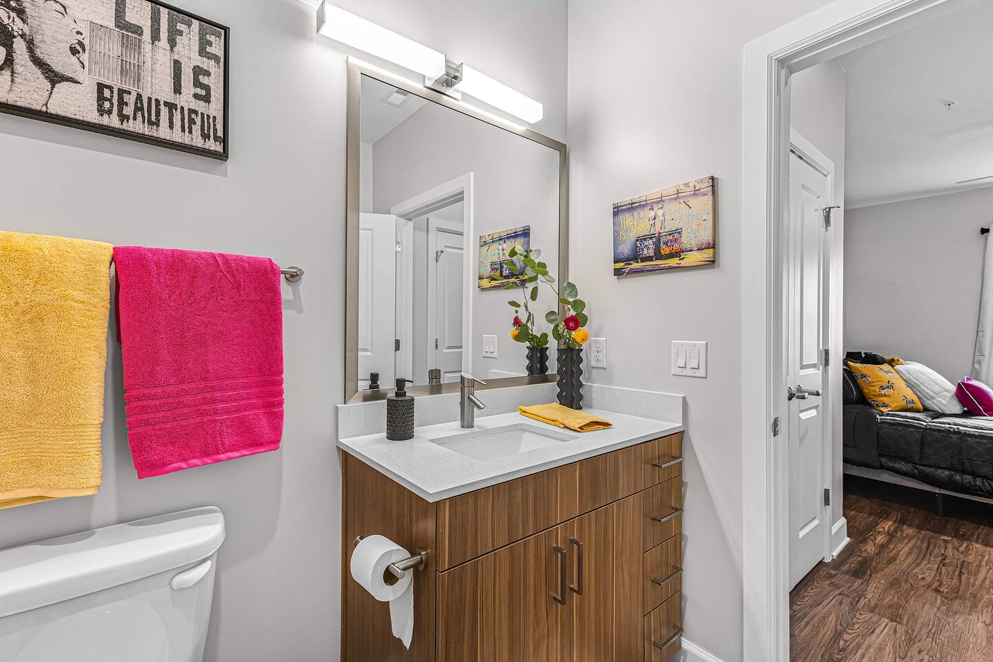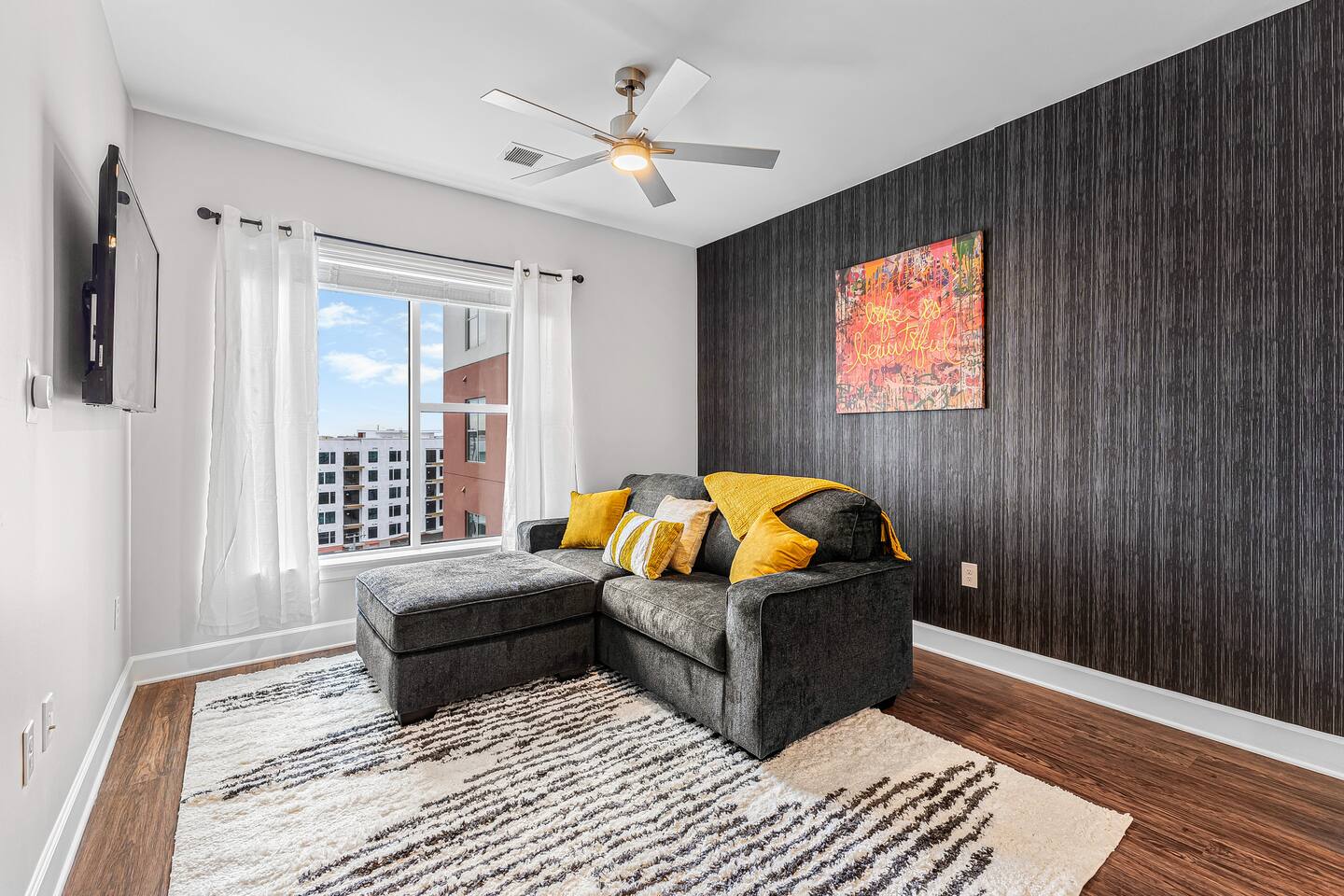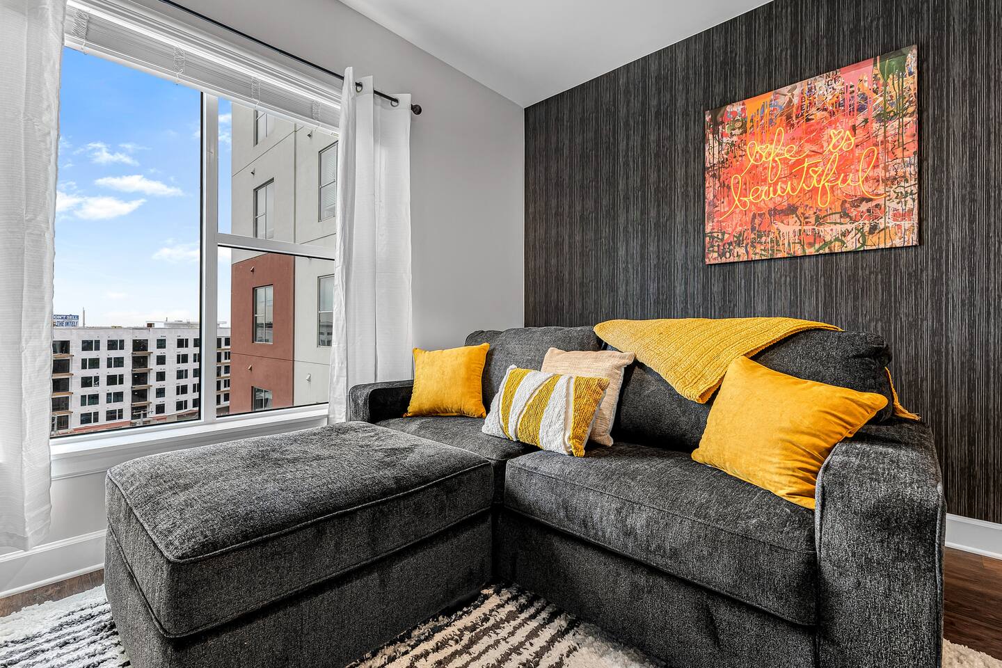 "Life is Beautiful" - enjoy it here! *The Space ->Spacious Living Room: Comfortable seating, a smart TV for streaming your favorite shows, and plenty of natural light. ->Fully Equipped Kitchen: high-end appliances, cookware, and a Ninja coffee maker! Dining table for two! ->Cozy Bedroom: Relax in a plush king-sized bed with luxury linens for a peaceful night’s sleep ->Modern Bathroom: Featuring sleek finishes, a shower/tub combo, and plush towels! *Amenities: Fast Wi-Fi Pool + Decks Gym In-unit washer/dryer Dedicated parking (for a fee, subject to availability) Complimentary toiletries, coffee, and snacks Parking Space for $15/night, please secure this upon booking, not guaranteed last minute !!Why You’ll Love It!! Walkable to everything: Whether you're here for a bachelorette weekend, a music festival, or just a getaway, you'll love how easy it is to explore the city's best spots by foot. Trendy & Comfy Vibes: Enjoy the perfect balance of style and comfort, with a thoughtful design that makes you feel right at home. Perfect for Groups or Solo Travelers: Ideal for couples, solo adventurers, or small groups looking to experience Nashville in a hip, central location. -> Please note this is a smart building, you will need to download an app to unlock all doors/gates in the building so please make sure you're okay with the tech -> We are in the city limits and there are trains that pass through, you will hear them, we do have sound machines to block noise