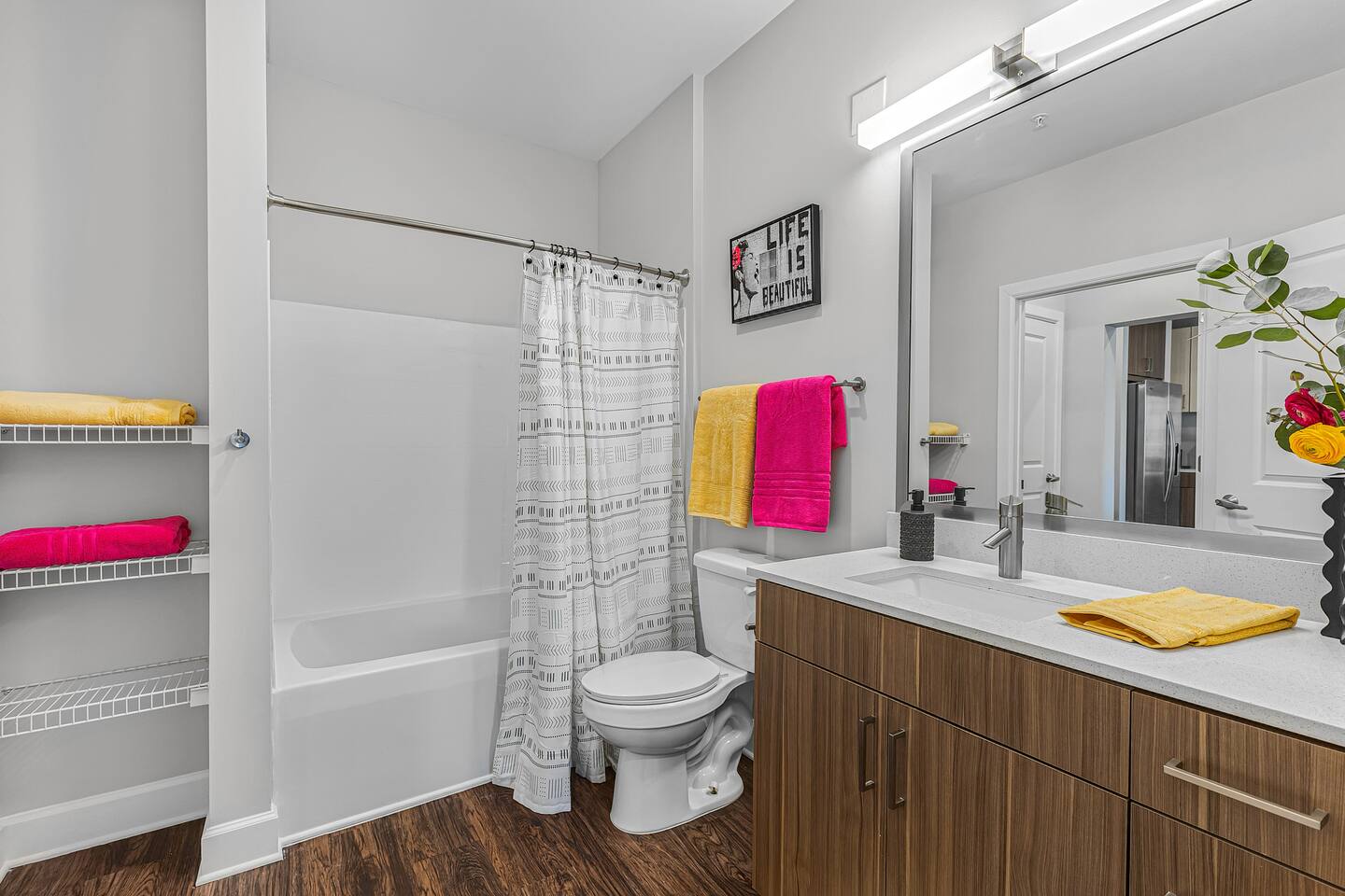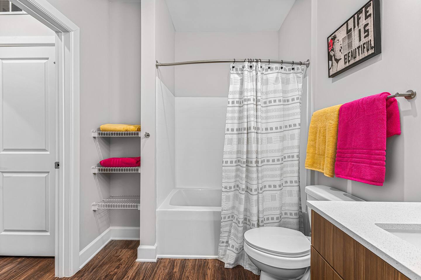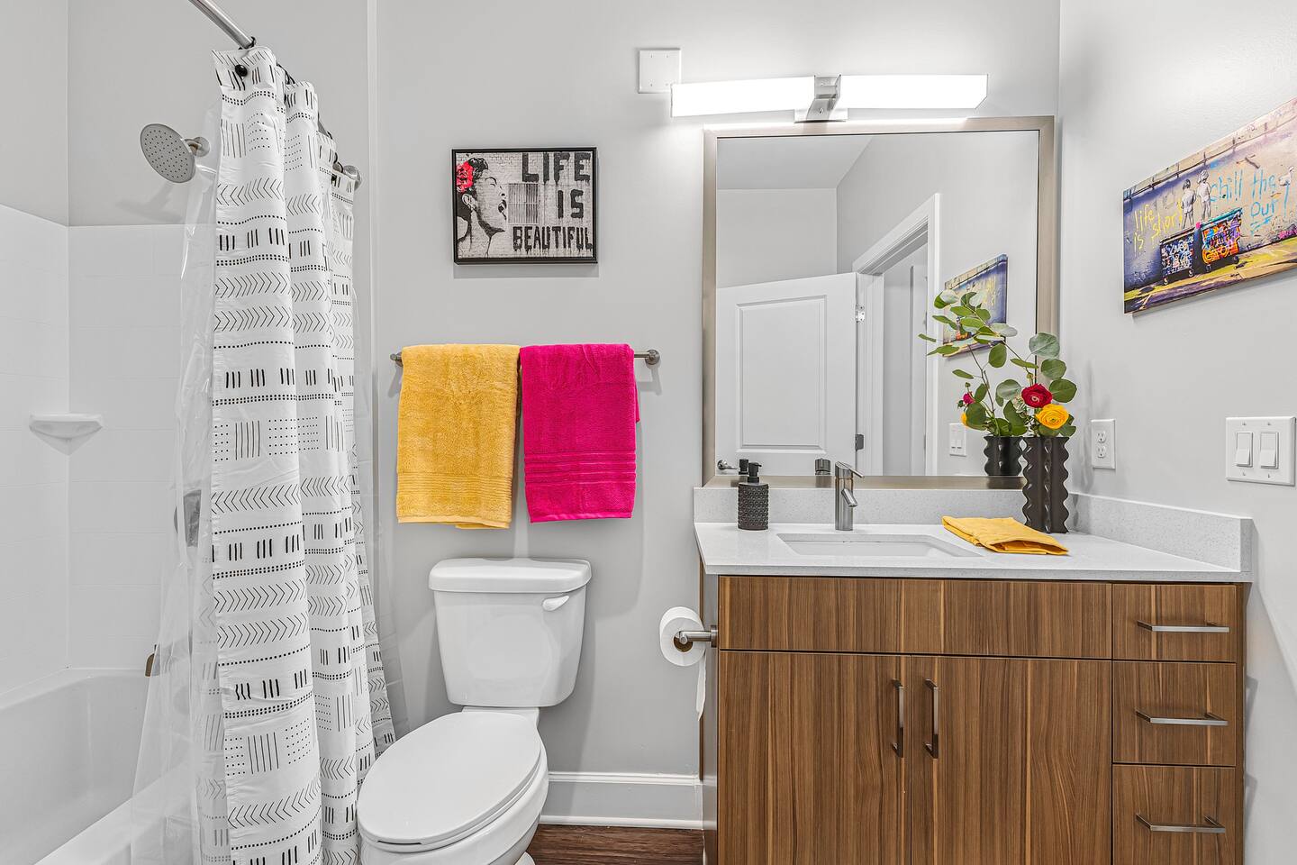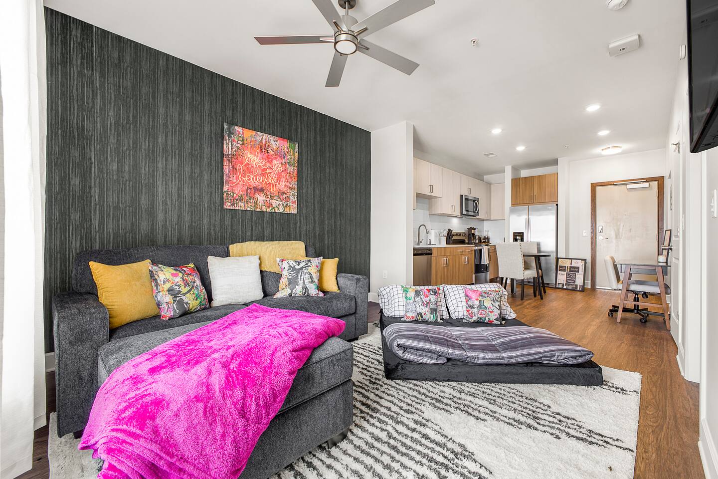 "Life is Beautiful" - enjoy it here! *The Space ->Spacious Living Room: Comfortable seating, a smart TV for streaming your favorite shows, and plenty of natural light. ->Fully Equipped Kitchen: high-end appliances, cookware, and a Ninja coffee maker! Dining table for two! ->Cozy Bedroom: Relax in a plush king-sized bed with luxury linens for a peaceful night’s sleep ->Modern Bathroom: Featuring sleek finishes, a shower/tub combo, and plush towels! *Amenities: Fast Wi-Fi Pool + Decks Gym In-unit washer/dryer Dedicated parking (for a fee, subject to availability) Complimentary toiletries, coffee, and snacks Parking Space for $15/night, please secure this upon booking, not guaranteed last minute !!Why You’ll Love It!! Walkable to everything: Whether you're here for a bachelorette weekend, a music festival, or just a getaway, you'll love how easy it is to explore the city's best spots by foot. Trendy & Comfy Vibes: Enjoy the perfect balance of style and comfort, with a thoughtful design that makes you feel right at home. Perfect for Groups or Solo Travelers: Ideal for couples, solo adventurers, or small groups looking to experience Nashville in a hip, central location. -> Please note this is a smart building, you will need to download an app to unlock all doors/gates in the building so please make sure you're okay with the tech -> We are in the city limits and there are trains that pass through, you will hear them, we do have sound machines to block noise