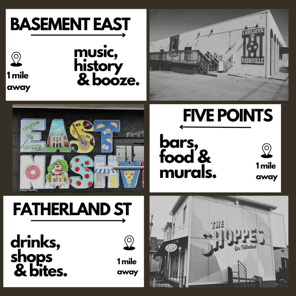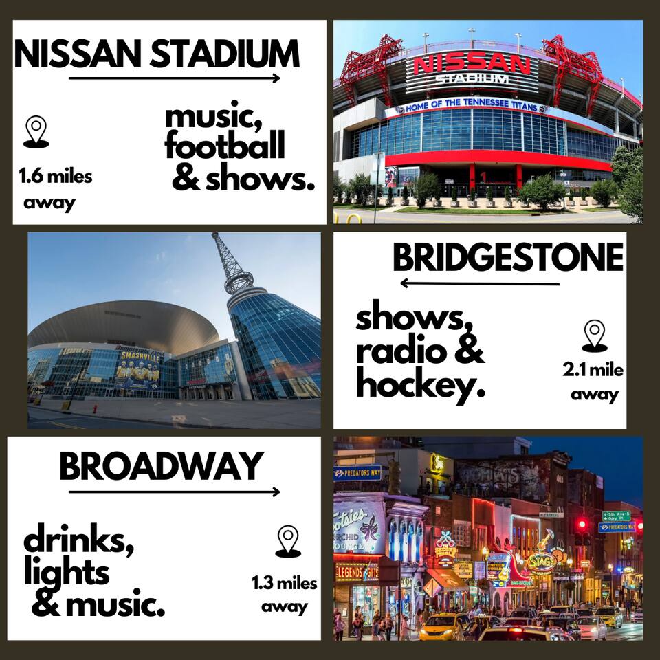 CENTRAL to it ALL! Nissan Stadium-> 6 min | 1.6 miles Bridgestone-> 8 min | 2.1 miles Broadway -> 5 min | 1.3 miles Midtown-> 10 min | 4 miles Basement East -> 4 min | 1 mile Opryland -> 16 min | 12 miles BNA -> 14 min | 8 miles