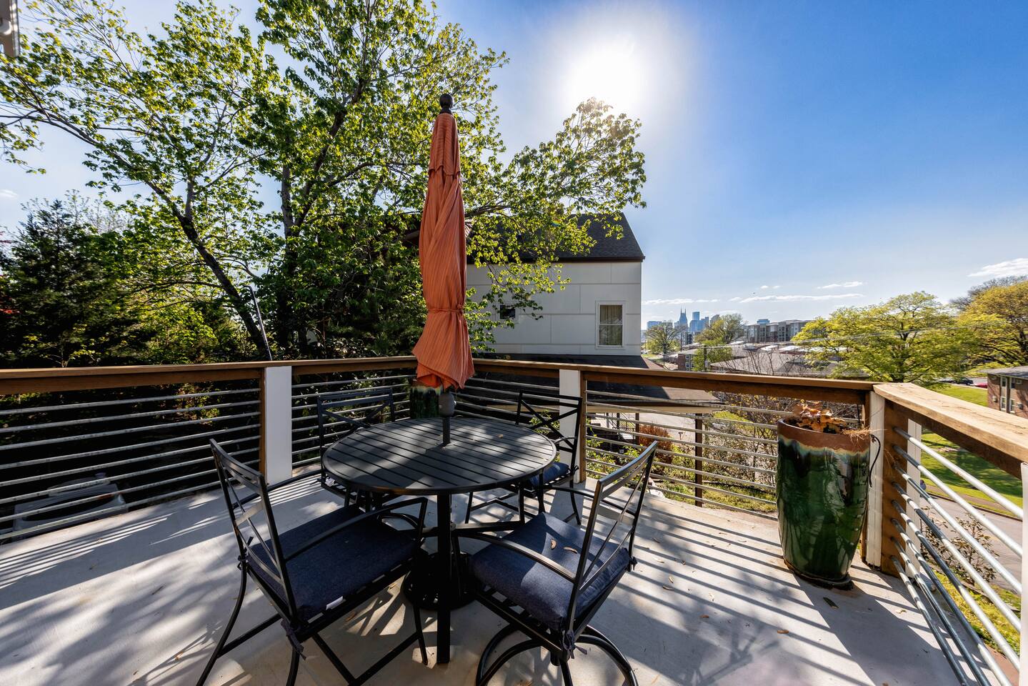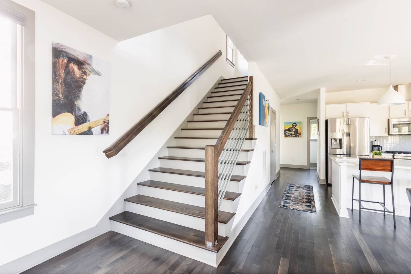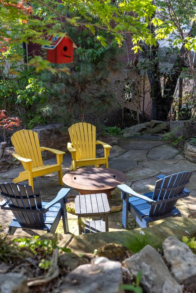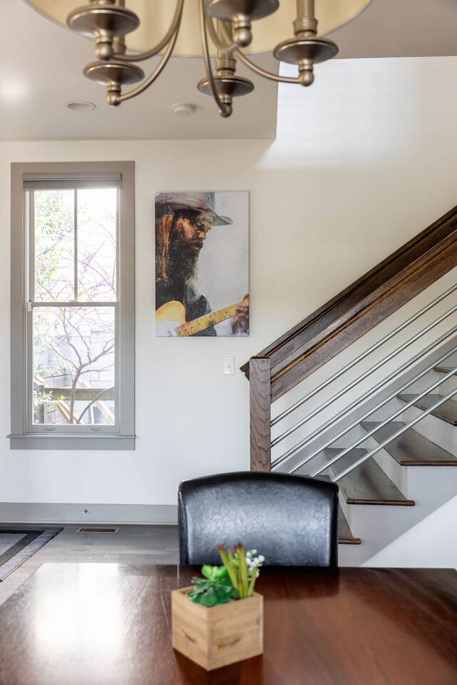 Hang outside enjoying the tranquil nature haven; firepit, outdoor eating area, Adirondack chairs, find your peace + serenity here! When you step inside be reminded you're in Music City y'all! -From Chris Stapleton to Britney Spears you've got the Nashville vibe in every room of this beautiful home. First Floor -> Living area w/ tv -> Full Kitchen -> Dining area -> Half bath **Balcony off the dining area has city skyline views! On 4th of July you have a direct view to the fireworks! Second Floor -> Master bedroom: King Bed ->Master Bath: Shower ->Queen Guest Room ->Full Size beds- Bunk Room -> Full Bathroom for Queen/Twin Room **Outdoor Nature Haven + Patio! **Parking for 2 cars outside our gate + extra street parking!