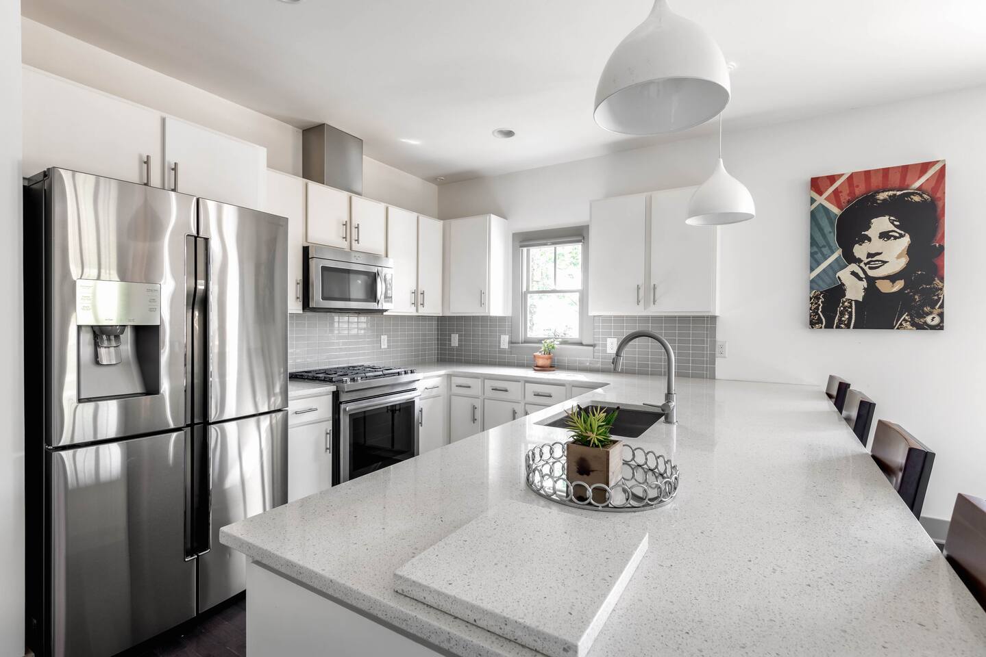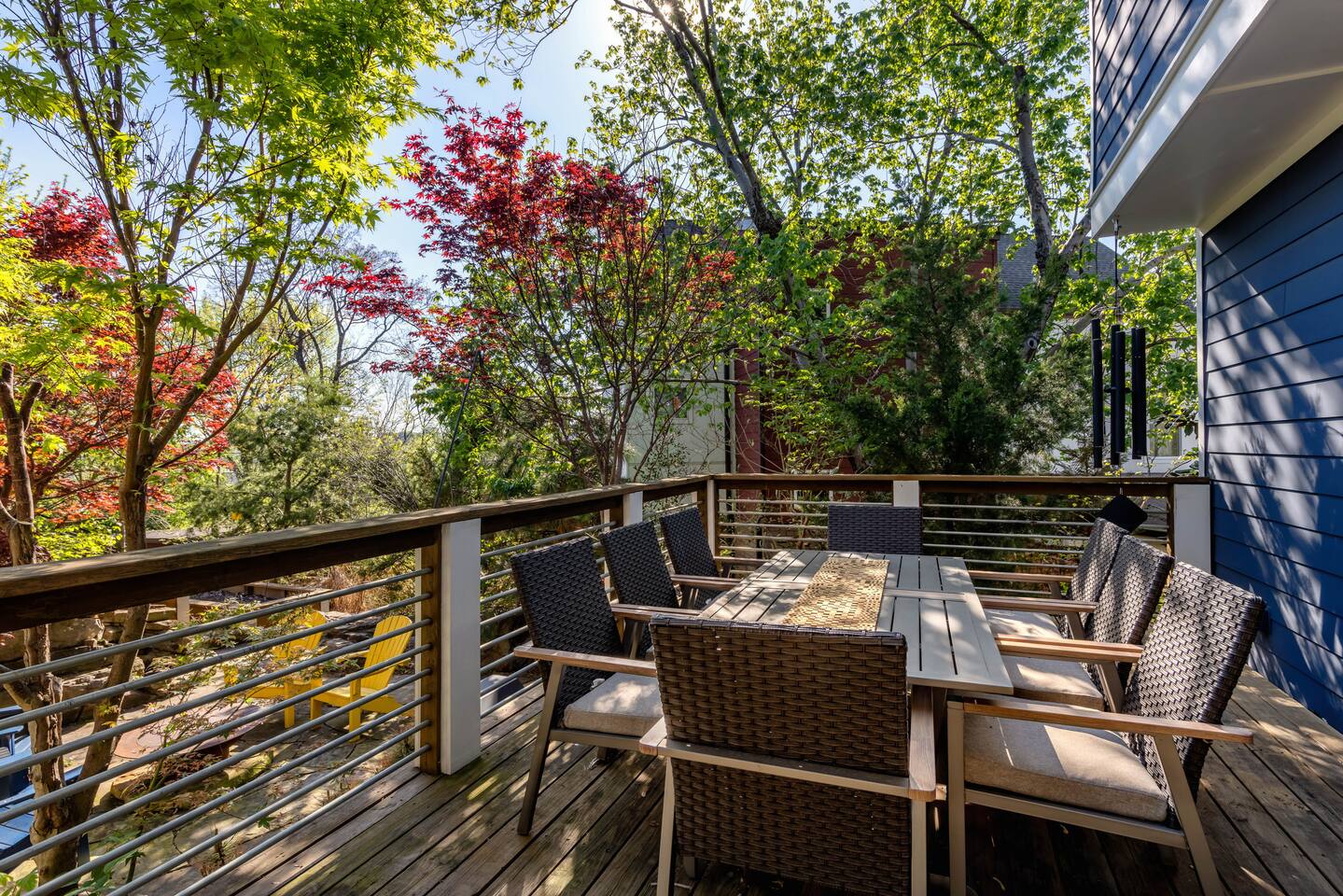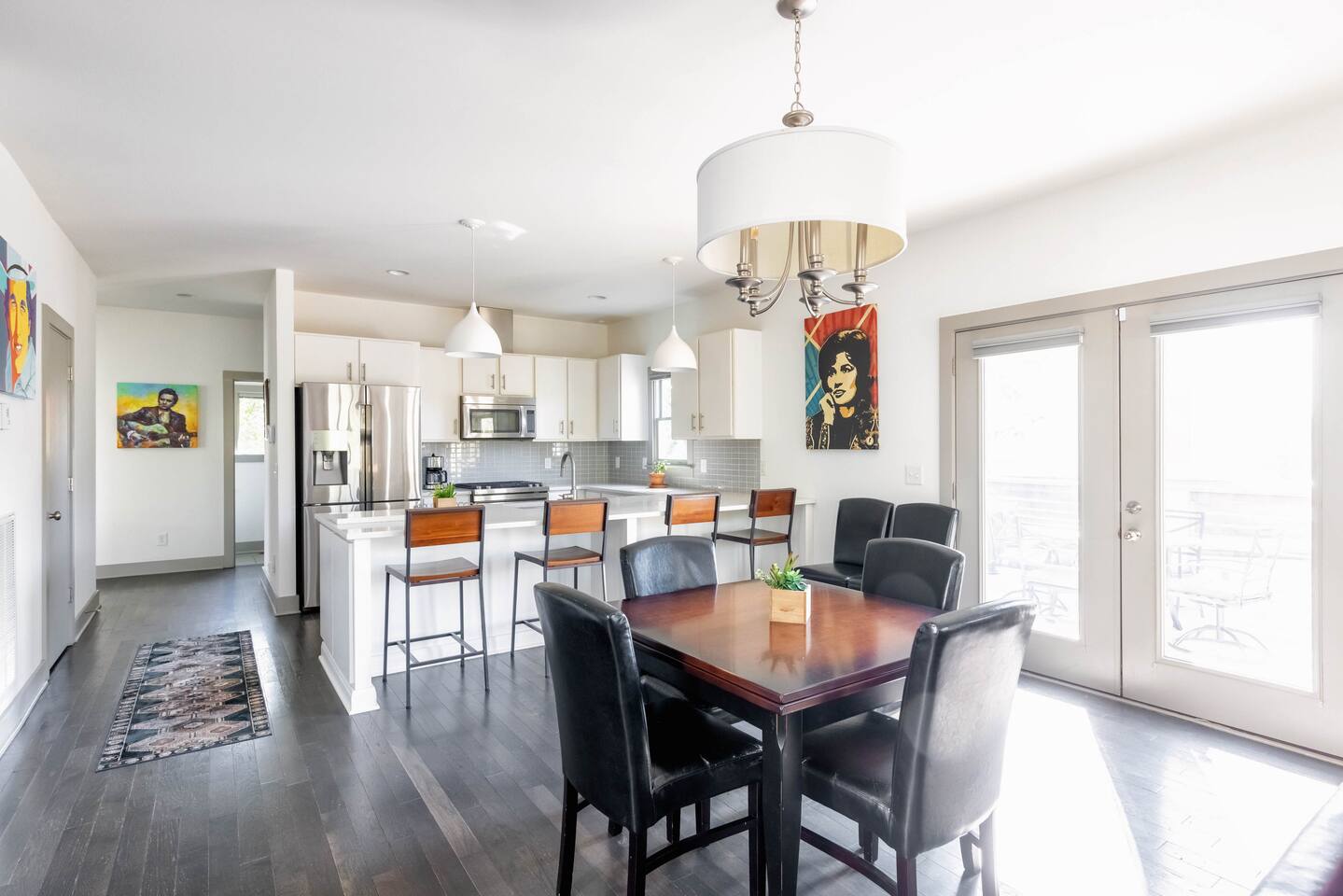Hang outside enjoying the tranquil nature haven; firepit, outdoor eating area, Adirondack chairs, find your peace + serenity here! When you step inside be reminded you're in Music City y'all! -From Chris Stapleton to Britney Spears you've got the Nashville vibe in every room of this beautiful home. First Floor -> Living area w/ tv -> Full Kitchen -> Dining area -> Half bath **Balcony off the dining area has city skyline views! On 4th of July you have a direct view to the fireworks! Second Floor -> Master bedroom: King Bed ->Master Bath: Shower ->Queen Guest Room ->Full Size beds- Bunk Room -> Full Bathroom for Queen/Twin Room **Outdoor Nature Haven + Patio! **Parking for 2 cars outside our gate + extra street parking!